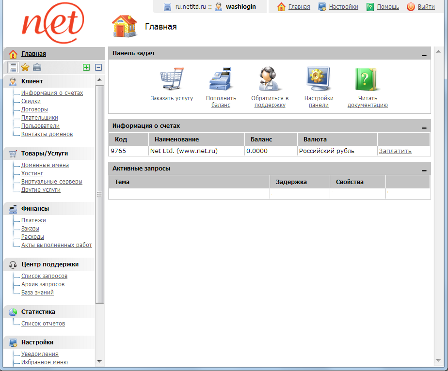Здесь вы можете посмотреть состояние своего лицевого счета (Информация о счетах), редактировать свои платежные данные (подраздел Плательщики), ознакомиться и запросить Договора (подраздел Договоры), определять кто имеет доступ и до каких разделов вашего кабинета (подраздел Пользователи), создавать и редактировать Контактные данные для своих доменов (подраздел Контакты доменов).