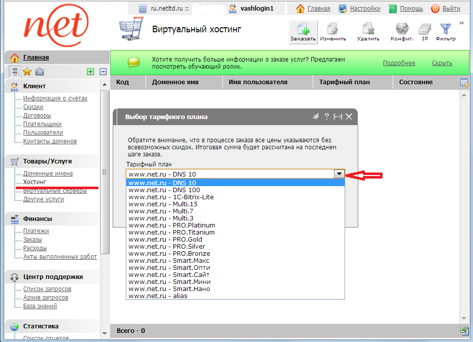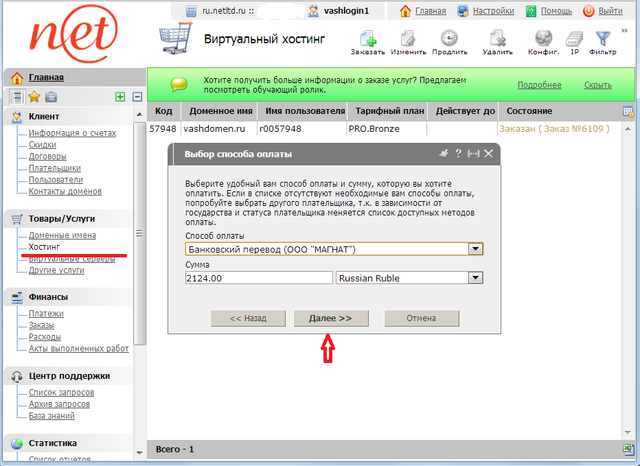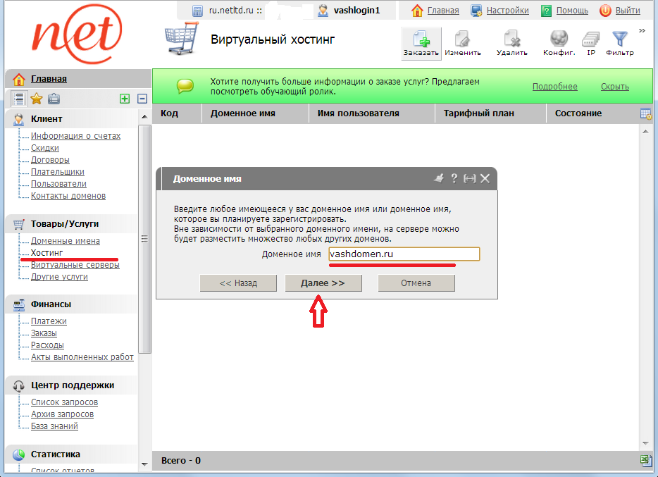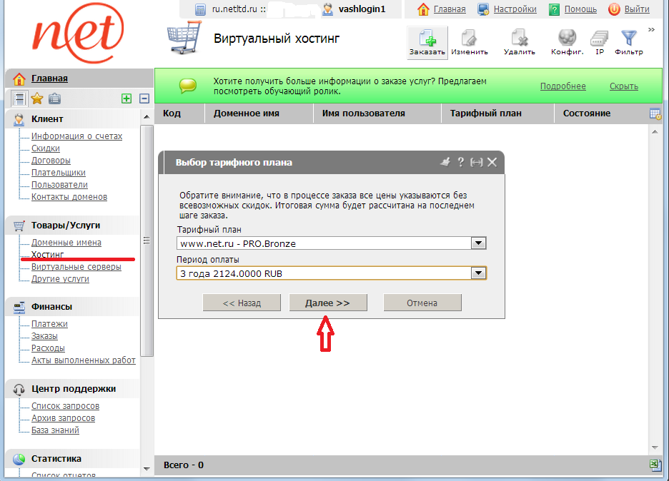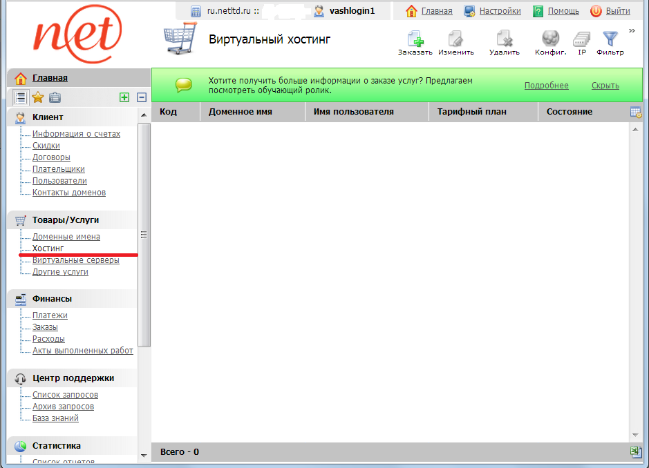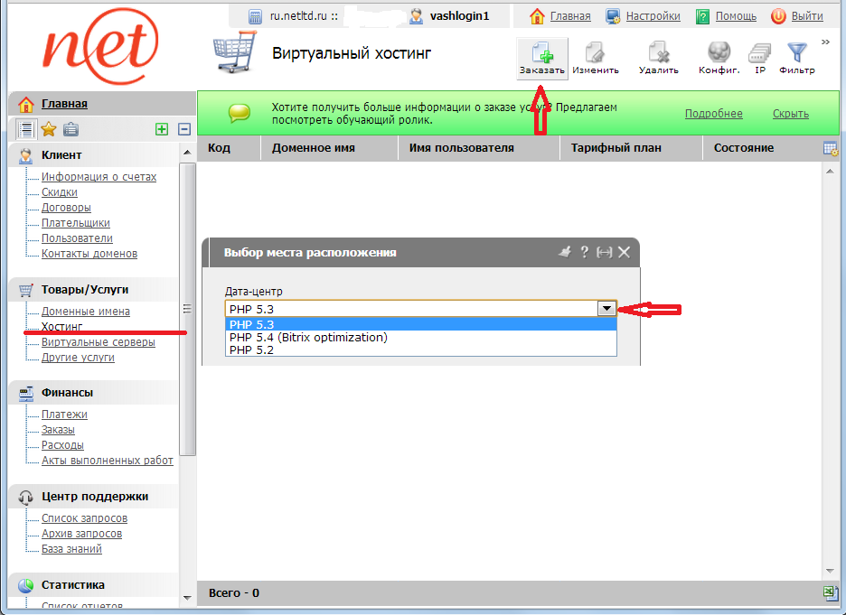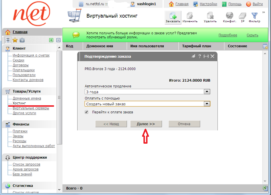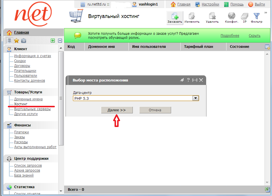 Если вы хотите заказать хостинг, то это можно сделать в вашем личном кабинете в разделе Товары/Услуги подразделе Хостинг.