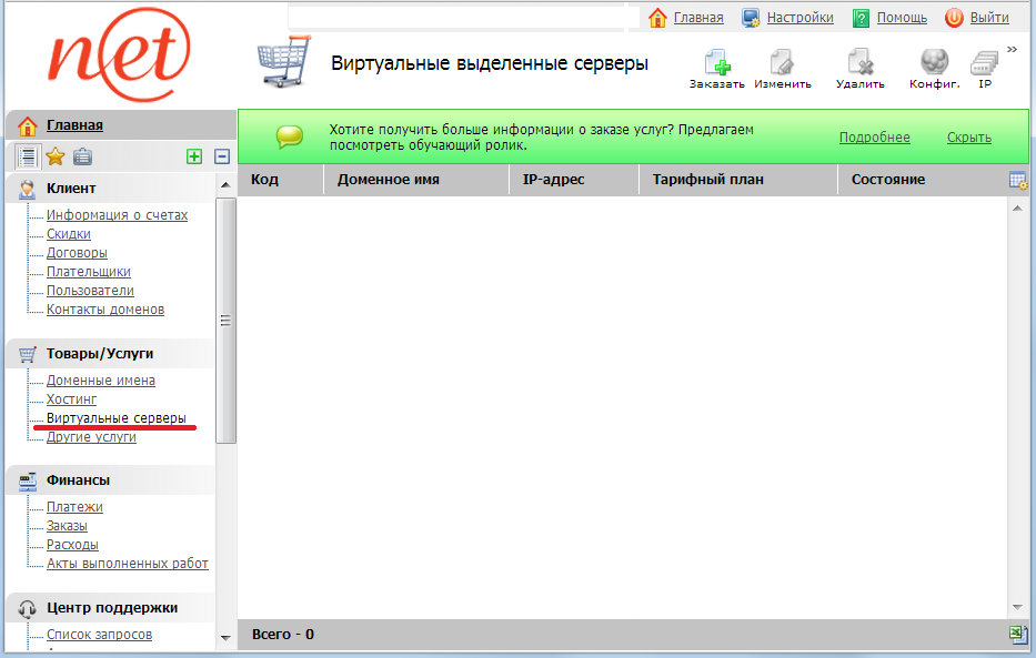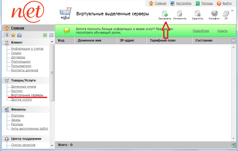 1. Раздел Товары/Услуги подраздел Виртуальные серверы
