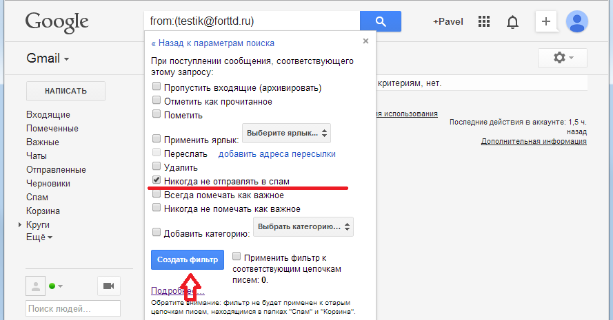 Для того, чтобы установить в Google фильтр для писем автоматически попадающих в спам, необходимо сделать следующее:
