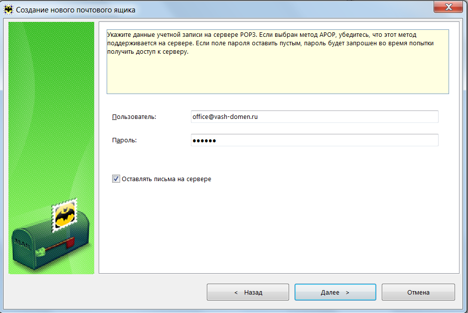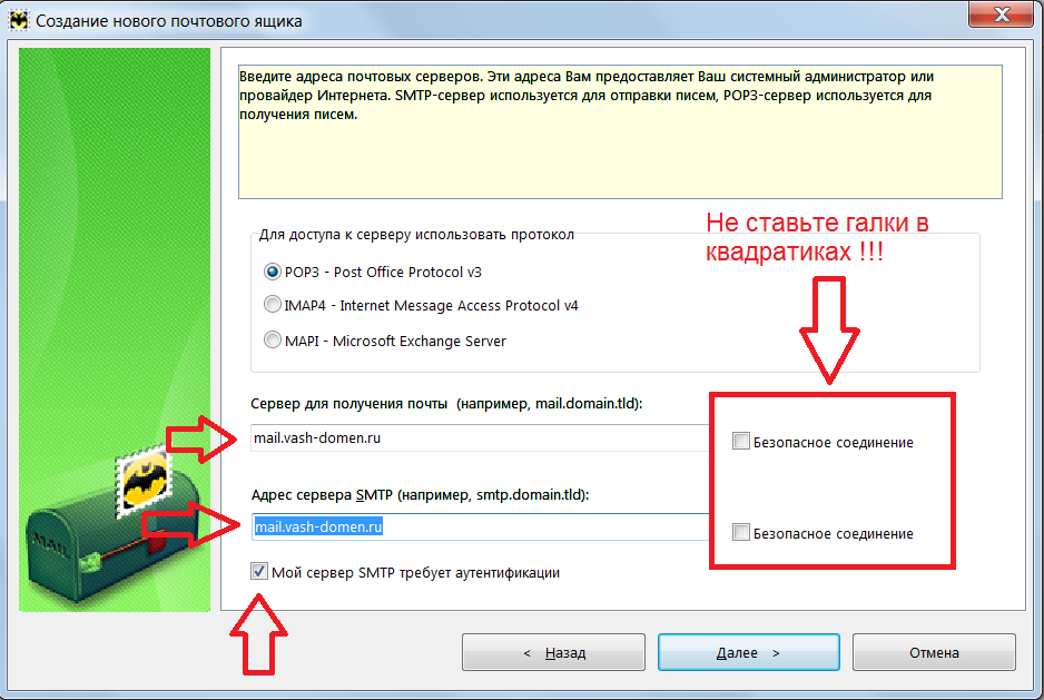 4. Укажите сервера для получения и отправки почты mail.vash-domen.ru
