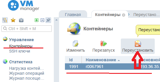VEManager -> Управление -> Контейнеры -> wash_container -> Иконка "Переустановить"