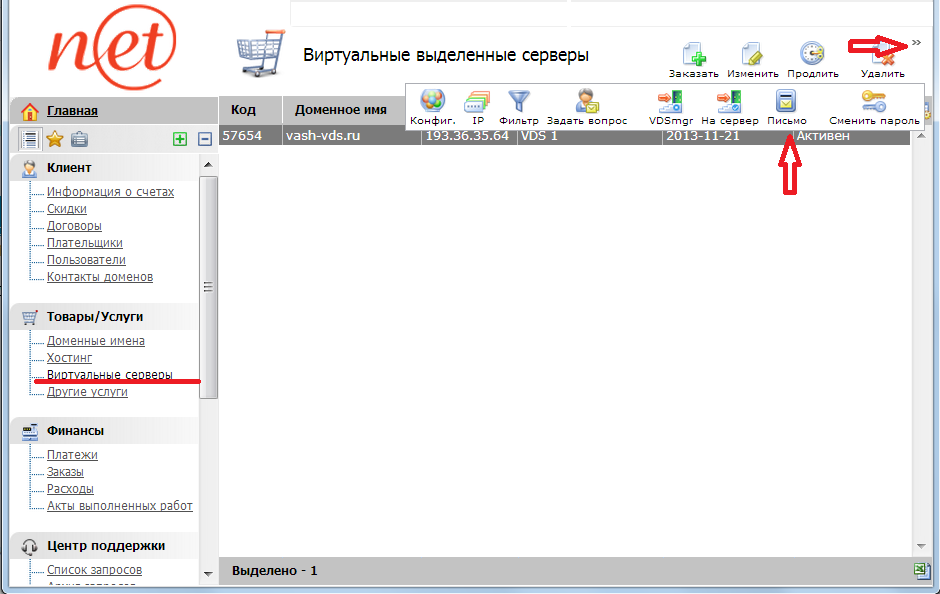 Слева в столбце вам нужен раздел Товары/Услуги, найдите в нем подраздел Виртуальные серверы и зайдите в него. Выделите ваш VDS и затем нажмите наверху в меню иконку :::Письмо. В появившемся окошке будут указаны все нужные вам данные доступа.